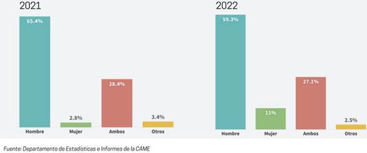 Si bien en las pymes comerciales la situación presenta una mejora para las mujeres, todavía falta mucho para alcanzar la igualdad. Durante este 2022, el 25,7% de los comercios son propiedad de mujeres, frente al 52,3% que pertenecen a hombres, y al 20,7% que dirigen personas de ambos géneros. Si se compara con el año anterior, la incidencia de mujeres en la propiedad de los comercios se mantuvo prácticamente igual: de 25,9% en 2021 pasó a 25,7% en este año. En cuanto a la participación, el 50,3% de los comercios encuestados indicaron que las decisiones son tomadas por una mujer o una mujer y un hombre.