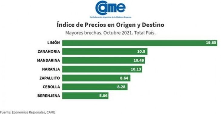 Según un reciente informe de CAME(Confederación Argentina de la Mediana Empresa), el consumidor pagó, en promedio, 5,6 veces más de lo que cobró el productor por esos alimentos. La participación del productor en los precios de venta se redujo levemente, a 25,7% en el mes. La diferencia de precios entre lo que pagó el consumidor y lo que recibió el productor en el campo por sus productos agropecuarios logró bajar al 4,9% por las mejoras en las brechas del tomate, el pimiento y la cebolla, principalmente.