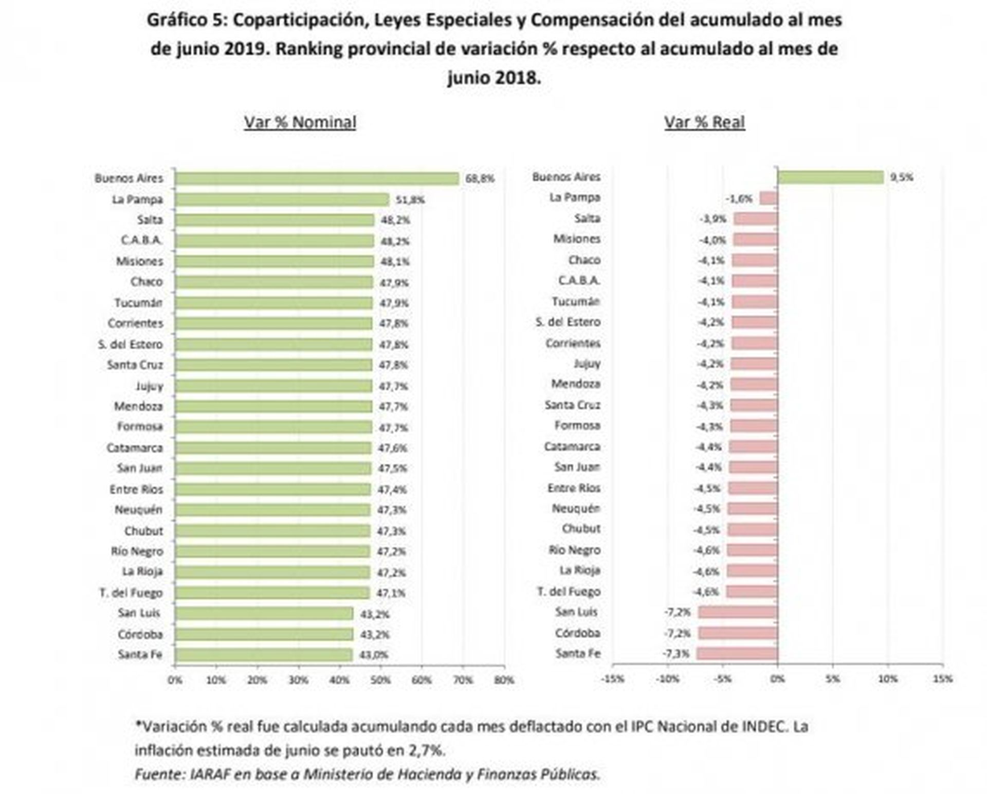 En el desglose provincia por provincia se advierte que el territorio gobernado por María Eugenia Vidal fue el más beneficiado ya que se detectó un mayor incremento con un aumento del 58,9% de fondos respecto a junio del 2018. En términos reales se traduce en una variación real positiva del 2,1%.