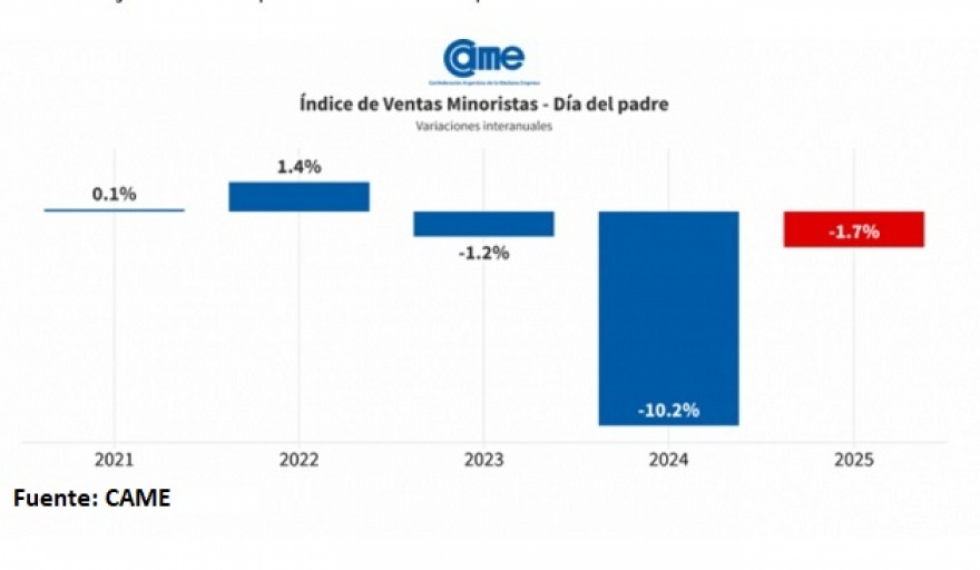 La oficialista Confederación Argentina de la Mediana Empresa (CAME) alertó sobre el impacto negativo que tuvo el Día del Padre en el comercio minorista, con una baja estimada del 2 % al 3 % en unidades vendidas respecto al año anterior. Vicente Lourenzo, vocero de la entidad, expresó su preocupación y ahora advierte que “Si no se recupera el poder adquisitivo, el segundo semestre será aún más complicado”.
