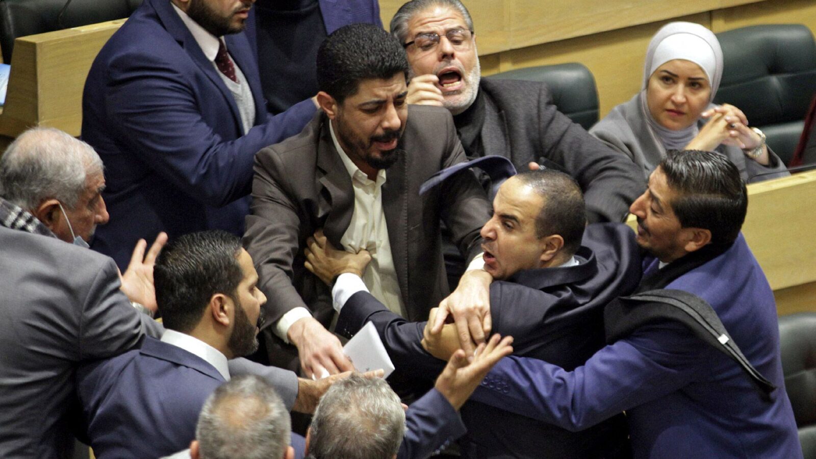 En un extremo del recinto, el titular del bloque del Movimiento de Integración y Desarrollo (MID), Oscar Zago, y el diputado de LLA Lisandro Almirón se agarraron a golpes.