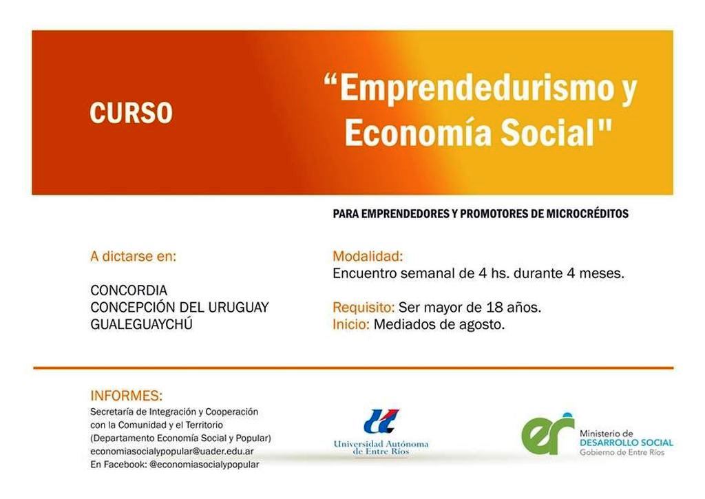 Junto al Ministerio de Desarrollo Social de Entre Ríos, con el apoyo de los municipios, la UADER desarrollará el Curso «Emprendedurismo y Economía Social» en las sedes Gualeguaychú, Concepción del Uruguay y Concordia. Inscripciones abiertas.