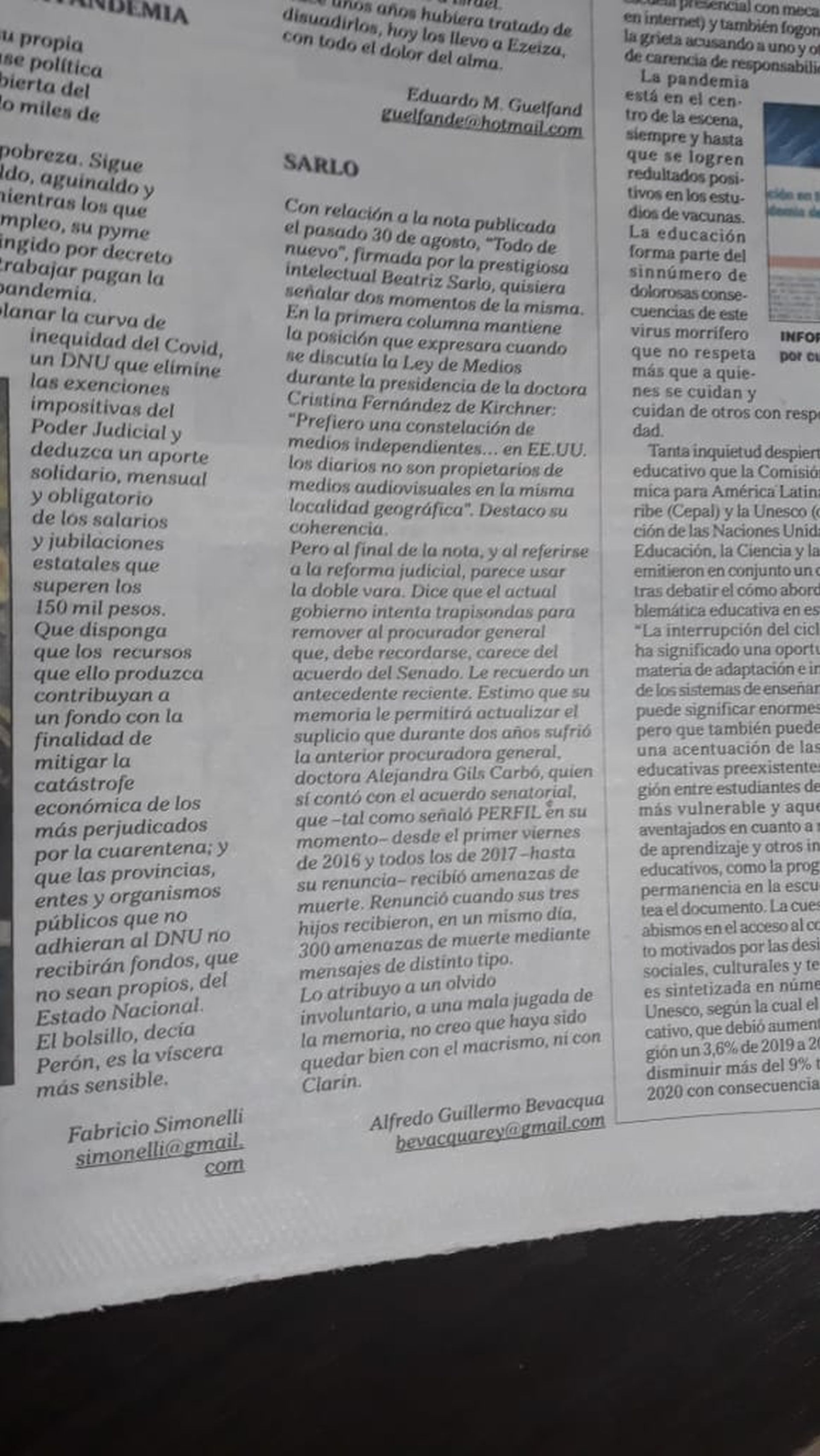 Con relación a la nota publicada el  pasado 30/08/2020, Todo de Nuevo, firmada por la prestigiosa intelectual, Sra. Beatriz Sarlo,  quisiera señalar dos momentos de la misma. En la primera columna mantiene la posición que expresara cuando se discutía la ley de medios durante la presidencia de la Dra. Cristina F. de Kirchner: “Prefiero una constelación de medios independientes… en EE.UU. los diarios no son propietarios de medios audiovisuales en la misma localidad geográfica.” Destaco  su coherencia.