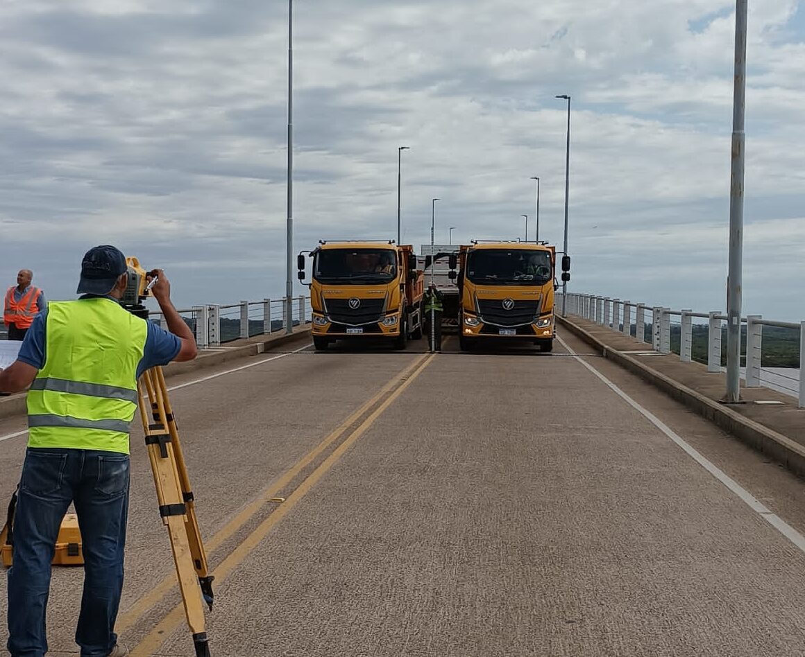 El ingeniero Juan Carlos Draper, Inspector de Obra contratado por CARU, explicó los alcances de estas pruebas que consisten en colocar, en lugares estratégicos, cinco camiones cargados previamente pesados para tomar una medición de variación de niveles por efecto de los camiones: “a través de este método, y otros más directos complementarios se evalúan constantes de elasticidad del puente, por ejemplo y otra serie de parámetros. Es un complemento de los ensayos en el marco de esta inspección principal de los puentes que se está haciendo”.