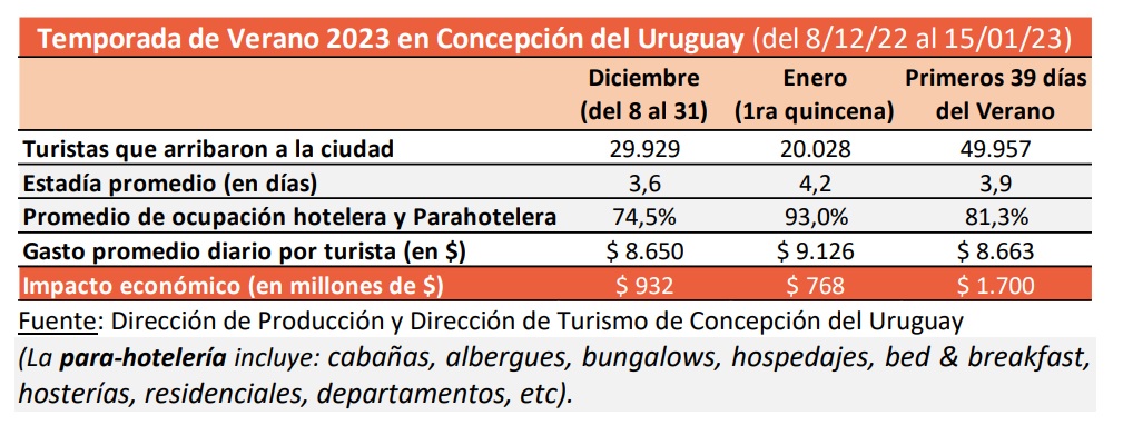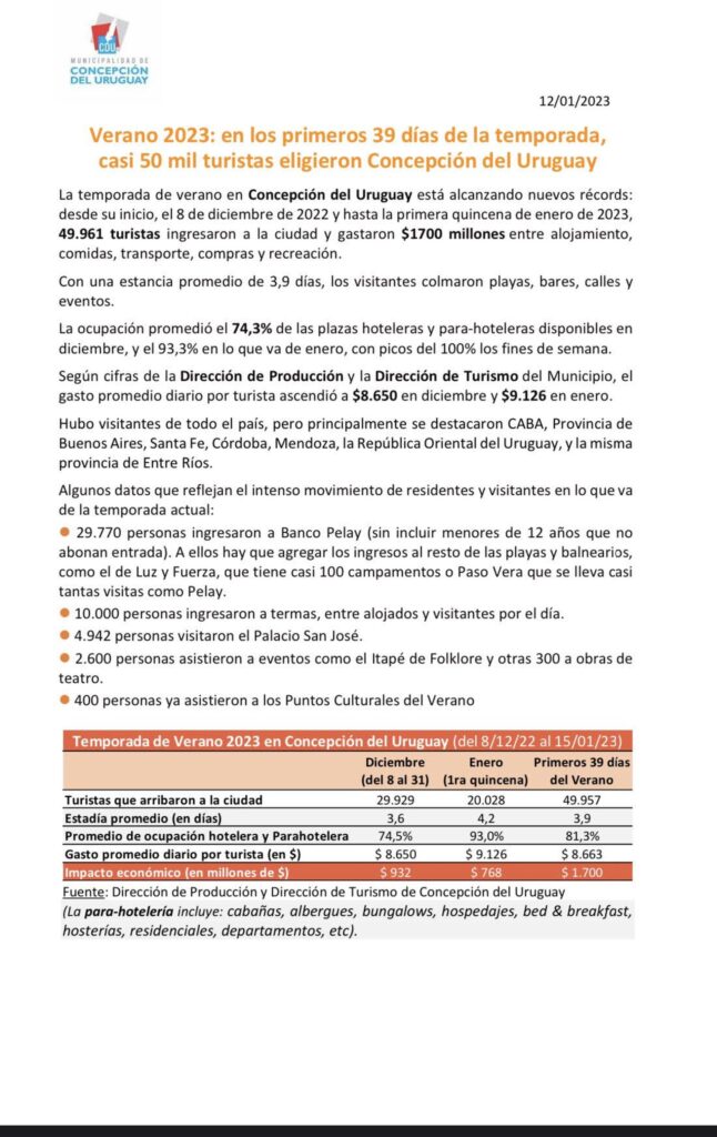 Las Direcciones de Producción y Turismo de la Municipalidad de Concepción del Uruguay, dieron a conocer un informe que expresa puntualmente -bajo el título- «Verano 2023: en los primeros 39 días de la temporada, casi 50 mil turistas eligieron Concepción del Uruguay», lo siguiente: