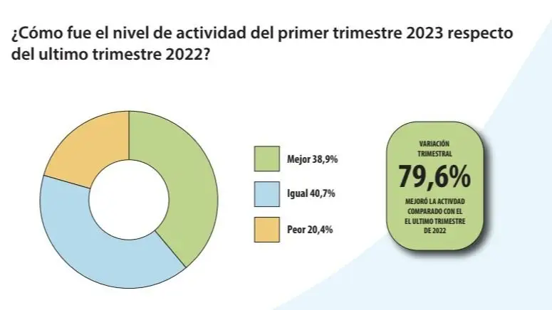 El relevamiento fue hecho entre pequeñas y medianas empresas de los rubros industria, servicios y comercio, además de un pequeño porcentaje perteneciente a la construcción. Los resultados revelaron que, aun en el contexto de aceleración inflacionaria, un 79,6% de las pymes mejoró o mantuvo su actividad en el primer cuatrimestre a comparación con el último cuatrimestre de 2022. De estas, un 38,9% mejoró su actividad y otro 40,7% la mantuvo.