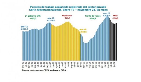 By Leo Iglesias12/02/2025Según un informe del Centro Económica Política Argentina (CEPA), en el primer año de Javier Milei, se destruyeron 119.954 puestos de trabajo registrados...