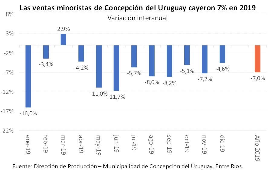 Las ventas del comercio minoristas de Concepción del Uruguay cayeron 4,6% anual en diciembre y 2019 cerró con una baja anual de 7%.