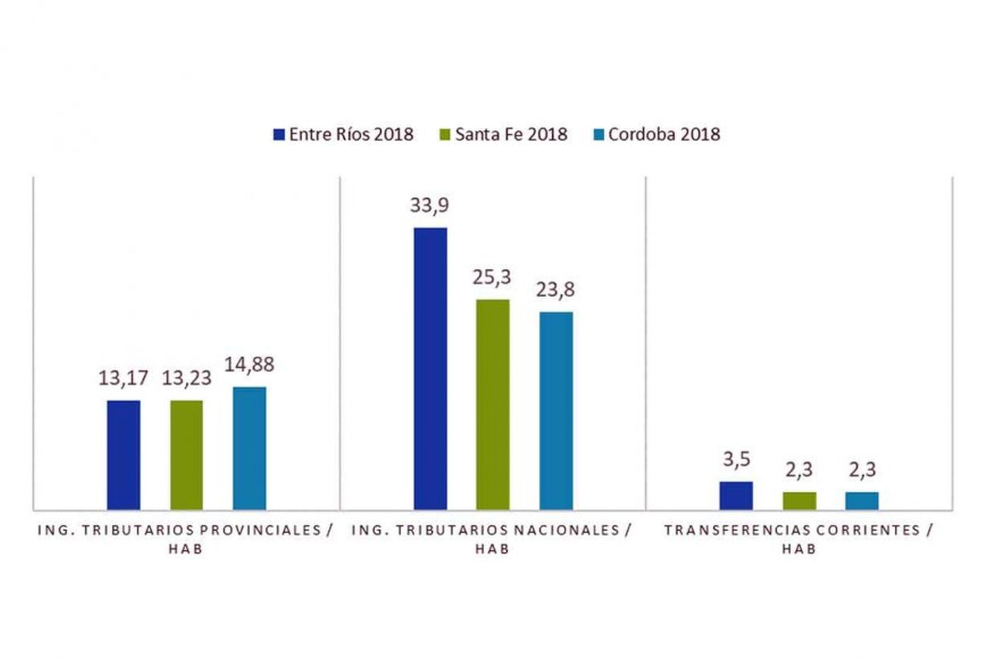 Esta diferencia se explica por las asimetrías de desarrollo que hay en nuestra provincia respecto a las pares de la Región Centro. En tanto, cuando se mide la presión impositiva provincial, Entre Ríos recauda $13 mil por habitante igual que Santa Fe y Córdoba. Es decir, aun cuando recibe desde la Nación un 36% de recursos adicionales por habitante, aplica un nivel de presión impositiva similar al de las otras dos provincias.
