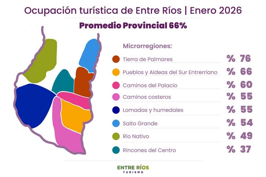 La Secretaría General de la Gobernación, a cargo de Mauricio Colello, presentó a través del Ente Mixto de Turismo de Entre Ríos (Emturer) los resultados estadísticos correspondientes a enero de 2026, elaborados a partir de la información brindada por los municipios y organizados por microrregiones. Durante el período, la provincia alcanzó un promedio de ocupación del 66 por ciento en plazas hoteleras y parahoteleras (hospedajes, bungalows, cabañas, casas y departamentos) y recibió un total de 2.085.383 visitantes.