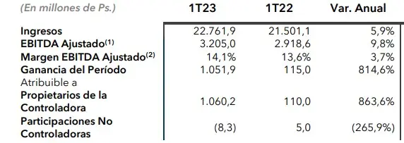 De acuerdo con el estado de resultados publicados por el Grupo, los Ingresos alcanzaron a los 22.761,9 millones de pesos en términos reales (descontada la inflación), con un incremento del 5,9 por ciento al compararlas con los 21.501,1 millones del primer trimestre del 2022.