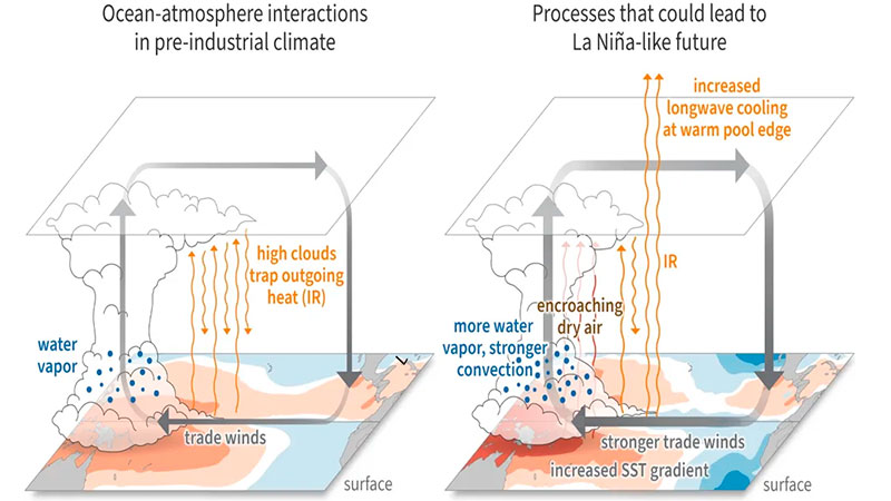 Los dos escenarios posibles son totalmente opuestos. Si las temperaturas se calientan más rápido en el Pacífico occidental que en el oriental, la circulación tropical de fondo podría volverse más parecida a La Niña que se repetiría durante más tiempo. Pero si el patrón de tendencia cambia a medida que las temperaturas globales siguen aumentando, es decir, si el este comienza a calentarse más rápido que el oeste en el futuro, toda la circulación a través del Pacífico tropical podría volverse más similar a El Niño.