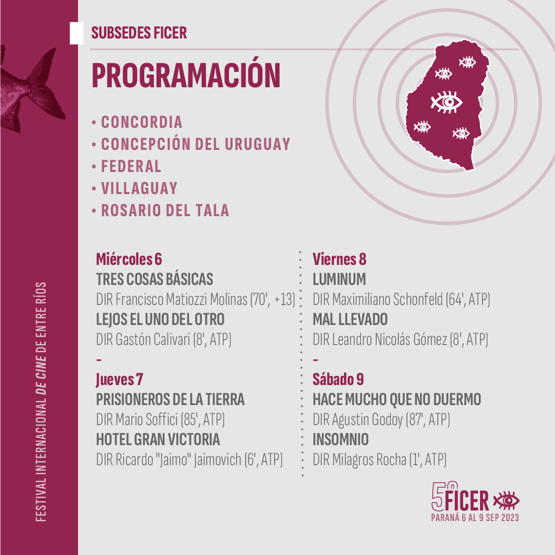 Los organizadores del evento indicaron que esta edición del FICER vuelve a contar con una gran impronta federal que permite conectar distintos puntos del territorio entrerriano en simultáneo. A lo largo de los cuatro días del evento, las localidades de Concordia, Concepción del Uruguay, Federal, Rosario del Tala y Villaguay proyectarán a diario cortometrajes y largometrajes de las distintas secciones del Festival que sumarán veinte funciones. Además, está programada la producción ganadora de la Sección Cine Nacional en Competencia 2022: Luminum, de Maximiliano Schonfeld.