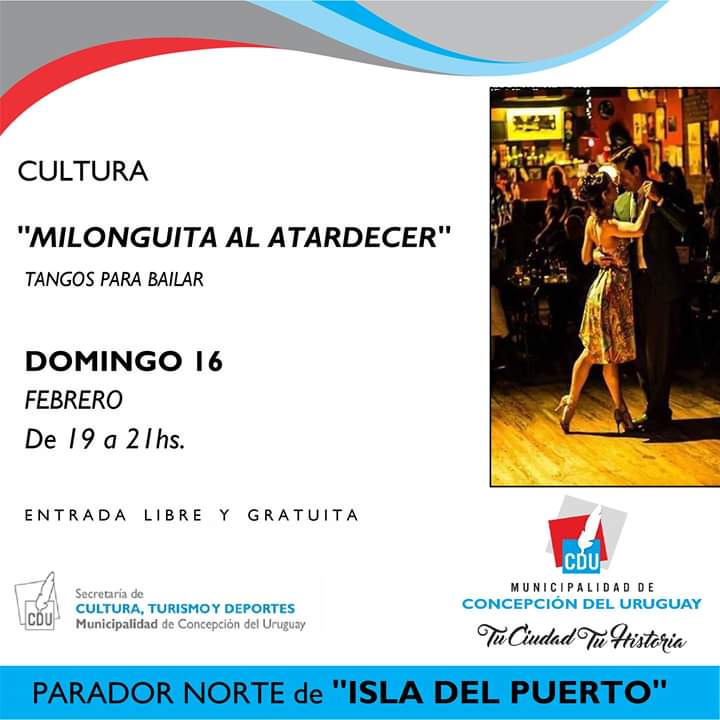 La Municipalidad, a través de la Dirección de Cultura, comienza a implementar un ciclo de Milongas Itinerantes. Se trata de una pista tanguera que recorrerá diversos espacios de Concepción del Uruguay, comenzando este domingo con la “Milonguita del Atardecer”. Será de 19 a 21 horas en el parador norte de la Avenida Costanera Isla del Puerto. Se realizará con música grabada, ajustándose a los decibeles permitidos en la Isla considerada como reserva de usos múltiples.
