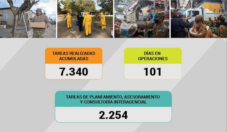 En el marco del Operativo General Belgrano que ya lleva más de 100 días de operaciones, las Fuerzas Armadas (FFAA) llevan realizadas 7.340 tareas acumuladas durante la pandemia de Covid-19, según el resumen semanal que emite el Ministerio de Defensa de la Nación actualizado el 29 de junio.