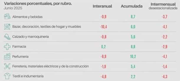 Por rubros, la única variación positiva interanual se dio en «Farmacia» (0,2%). Los demás sectores mostraron bajas: «Bazar, decoración, textiles para el hogar y muebles» (-10,4%); «Perfumería» (-8,9%); «Textil e indumentaria» (-4,8%); «Ferretería, materiales eléctricos y de la construcción» (-1,9%); «Alimentos y bebidas» (-0,9%) y «Calzado y marroquinería» (-0,8%).