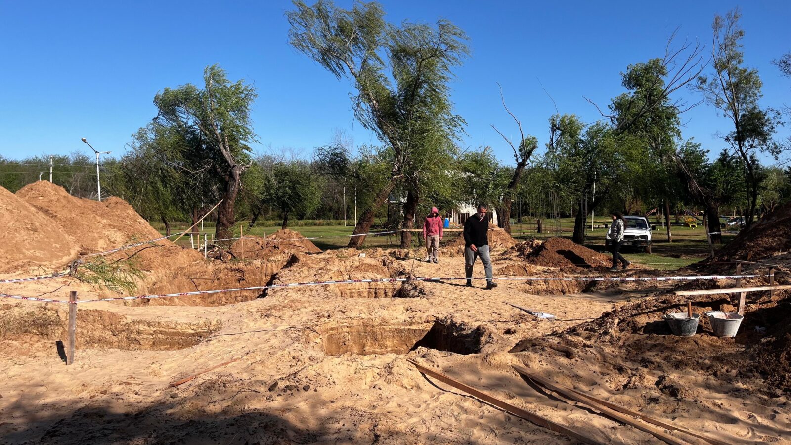 En estos momentos, se está construyendo la primera etapa, que consta de una estructura de hormigón armado, cerramiento y techado para los baños de damas y caballeros en planta alta, con un baño accesible en planta baja. Además, cada sanitario contará con lavadero y duchas. Asimismo, se está trabajando constantemente en los caminos y limpieza integral del predio.
