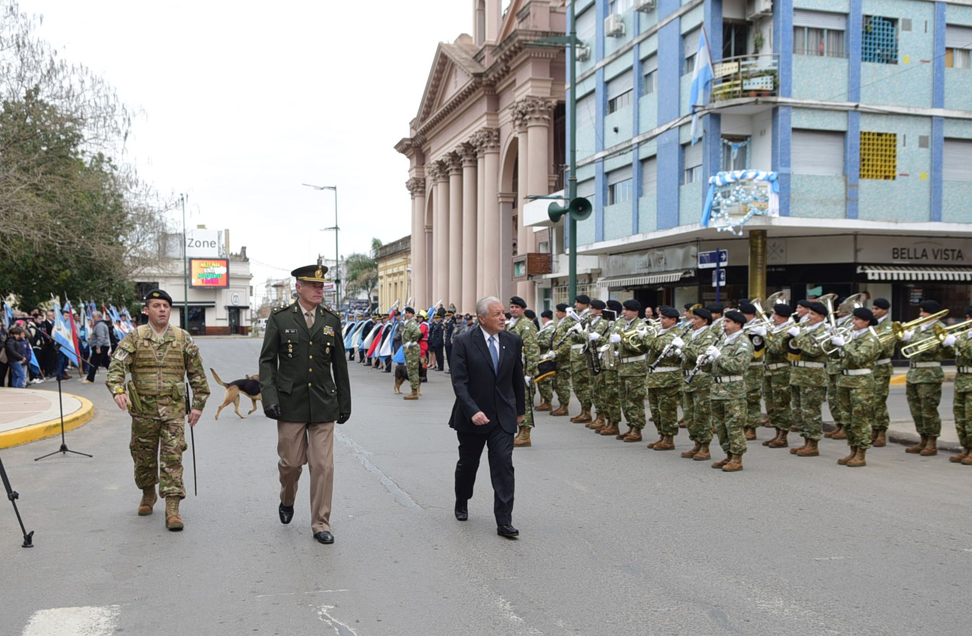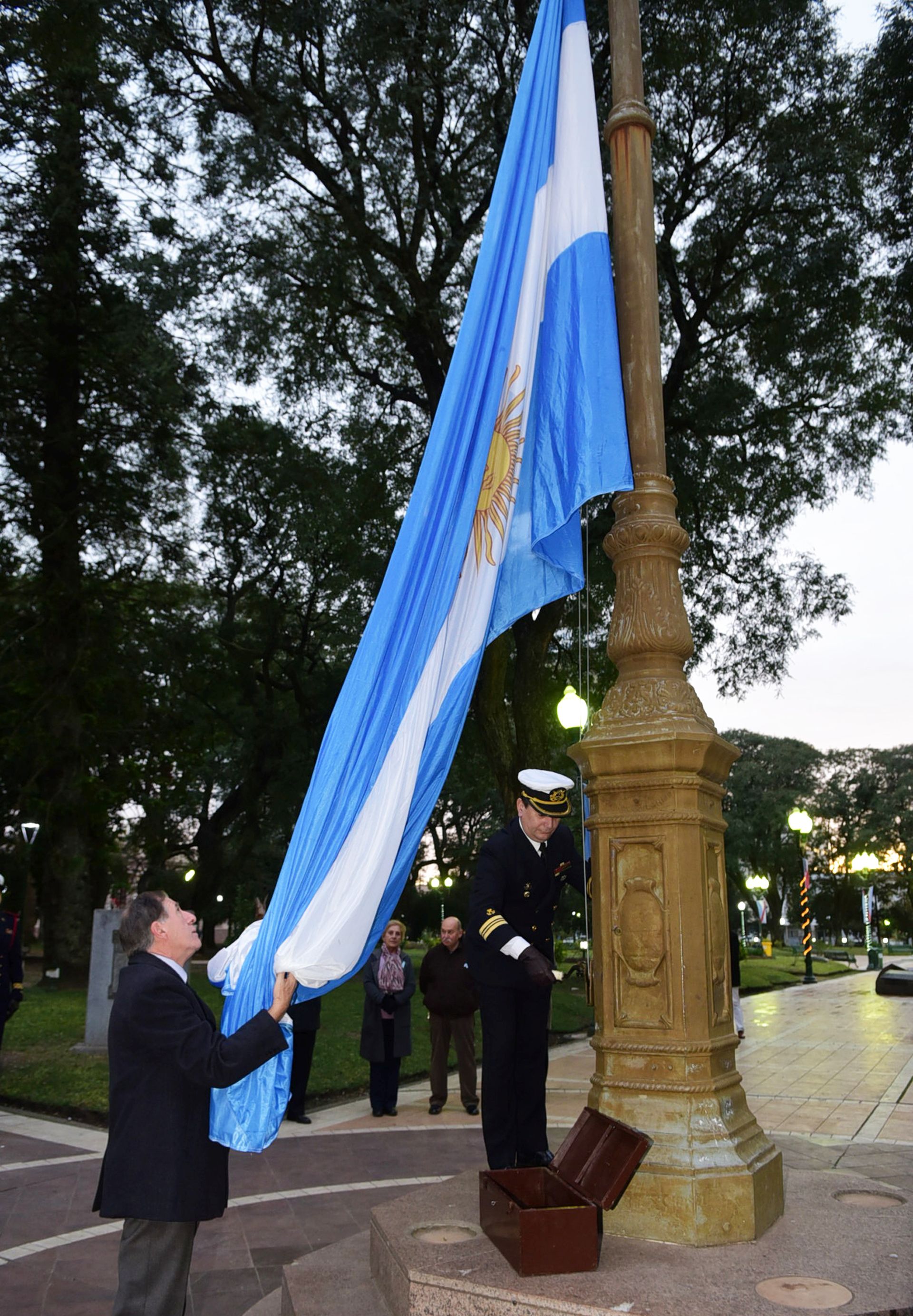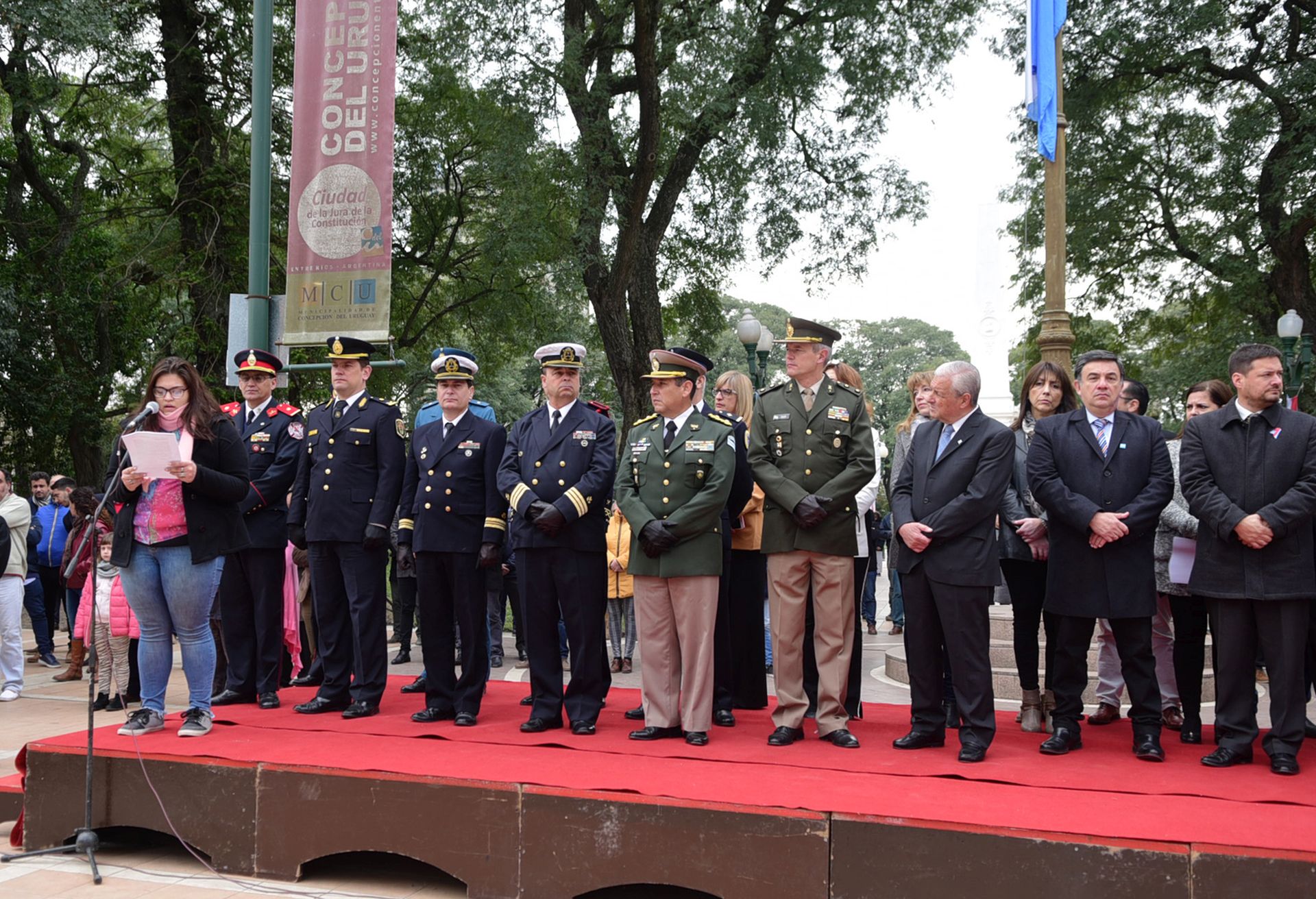 La ceremonia principal se desarrolló en la plaza en un palco montado a los pies del mástil frente a los históricos edificios del Colegio Urquiza y la Basílica Inmaculada Concepción. Estuvo encabezada por el intendente José Lauritto junto a autoridades civiles locales y provinciales, judiciales, de Fuerzas Armadas y de Seguridad, educativas y público en general.