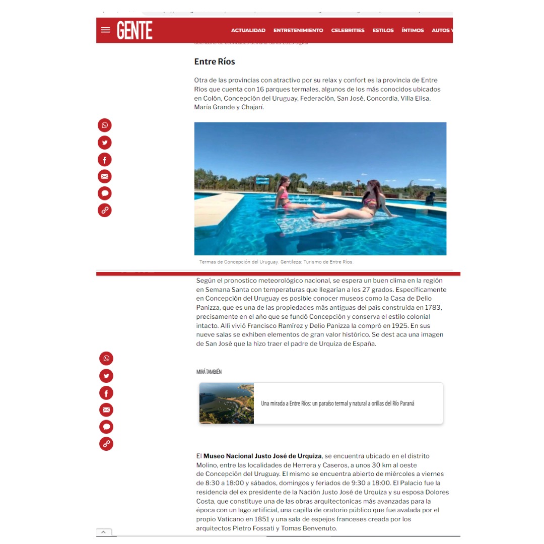 En el último número de la revista Gente y con el ánimo de promocionar el turismo, bajo el título «Semana Santa: cinco lugares de la Argentina para visitar el próximo fin de semana largo», se menciona puntualmente Entre Rios y -de la provincia- se destaca nuestra ciudad de Concepción del Uruguay.