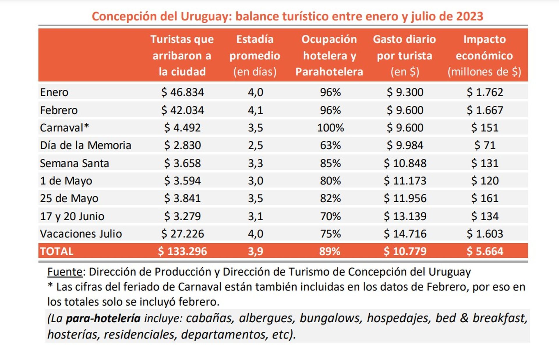 A estos datos hay que sumar el turismo que llegó los fines de semana normales, que es muy importante por la cantidad de eventos deportivos, artísticos, educativos y de otras temáticas que se organizan constantemente. Concepción del Uruguay es una ciudad de eventos, que se va ganando un lugar en el circuito turístico nacional,