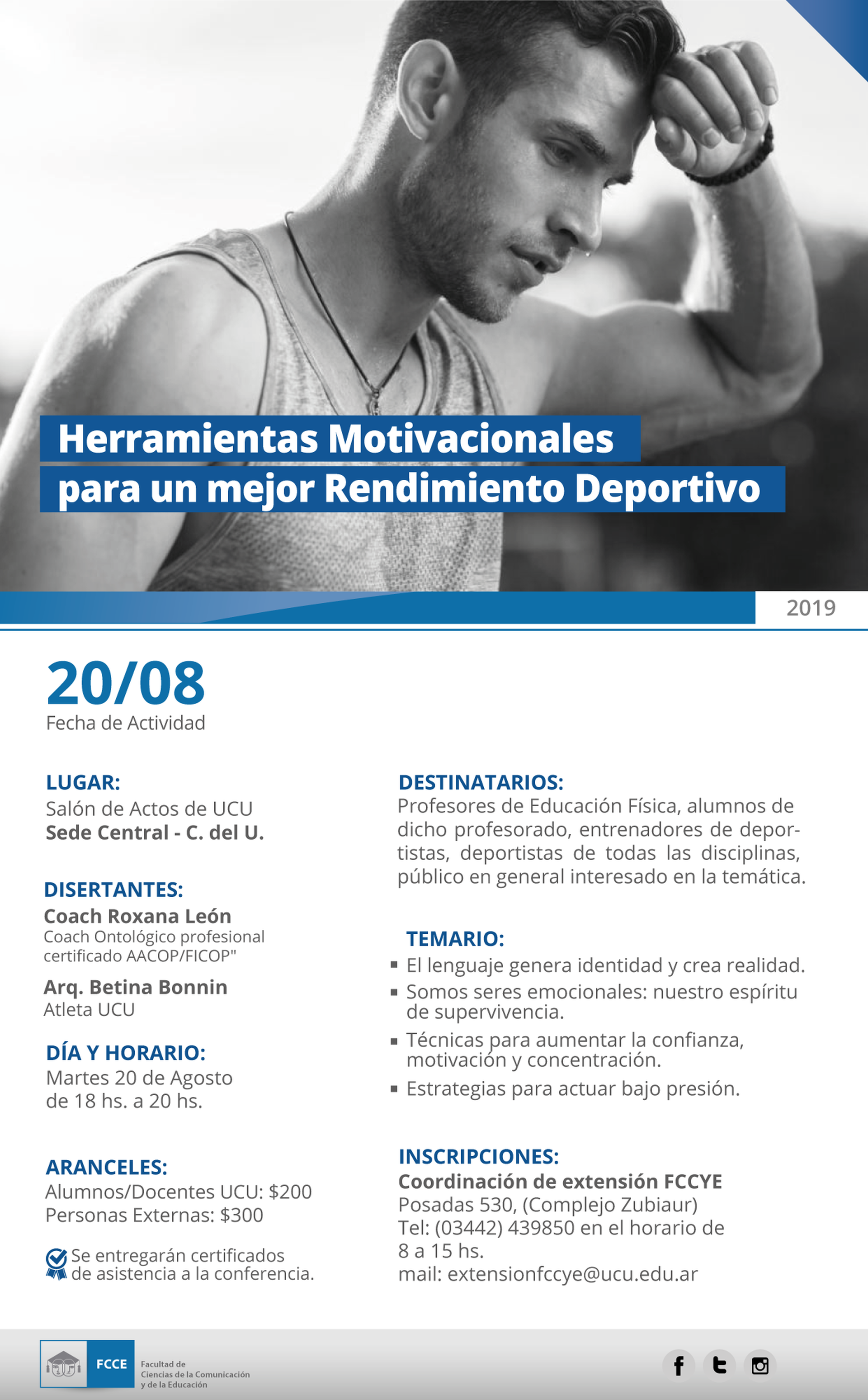 El martes 20 de agosto, de 18 a 20 hs. y en el Salón de Actos de UCU, se realizará una Conferencia sobre “HERRAMIENTAS MOTIVACIONALES PARA UN MEJOR RENDIMIENTO DEPORTIVO”. La misma tendrá como disertantes a la Prof. Roxana León, (Coach Ontológico AACOP-FICOP, mediadora educativa y neurosicoeducadora) y a la atleta UCU Betina Bonnin. La actividad tiene como destinatarios  a todas las personas involucradas en las diferentes disciplinas deportivas: deportistas,  entrenadores, familiares, Profesores de Educación Física y alumnos del Profesorado, kinesiólogos, nutricionistas, etc., además de al público en general interesado en la temática.