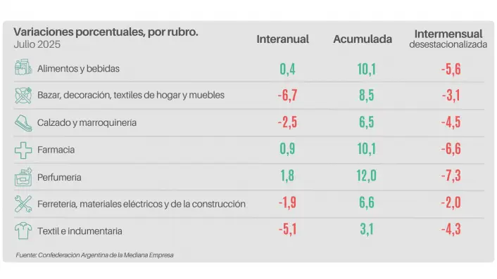 “Durante julio, las ventas en los distintos rubros estuvieron condicionadas por factores económicos que limitaron el consumo, como el endeudamiento de los hogares, el uso restringido del crédito y el aumento de los costos operativos”, indicó el relevamiento de CAME. Ante ese panorama, los comercios recurrieron a promociones, cuotas sin interés y descuentos, mientras que en algunos casos se incorporaron servicios como entregas a domicilio o venta online.