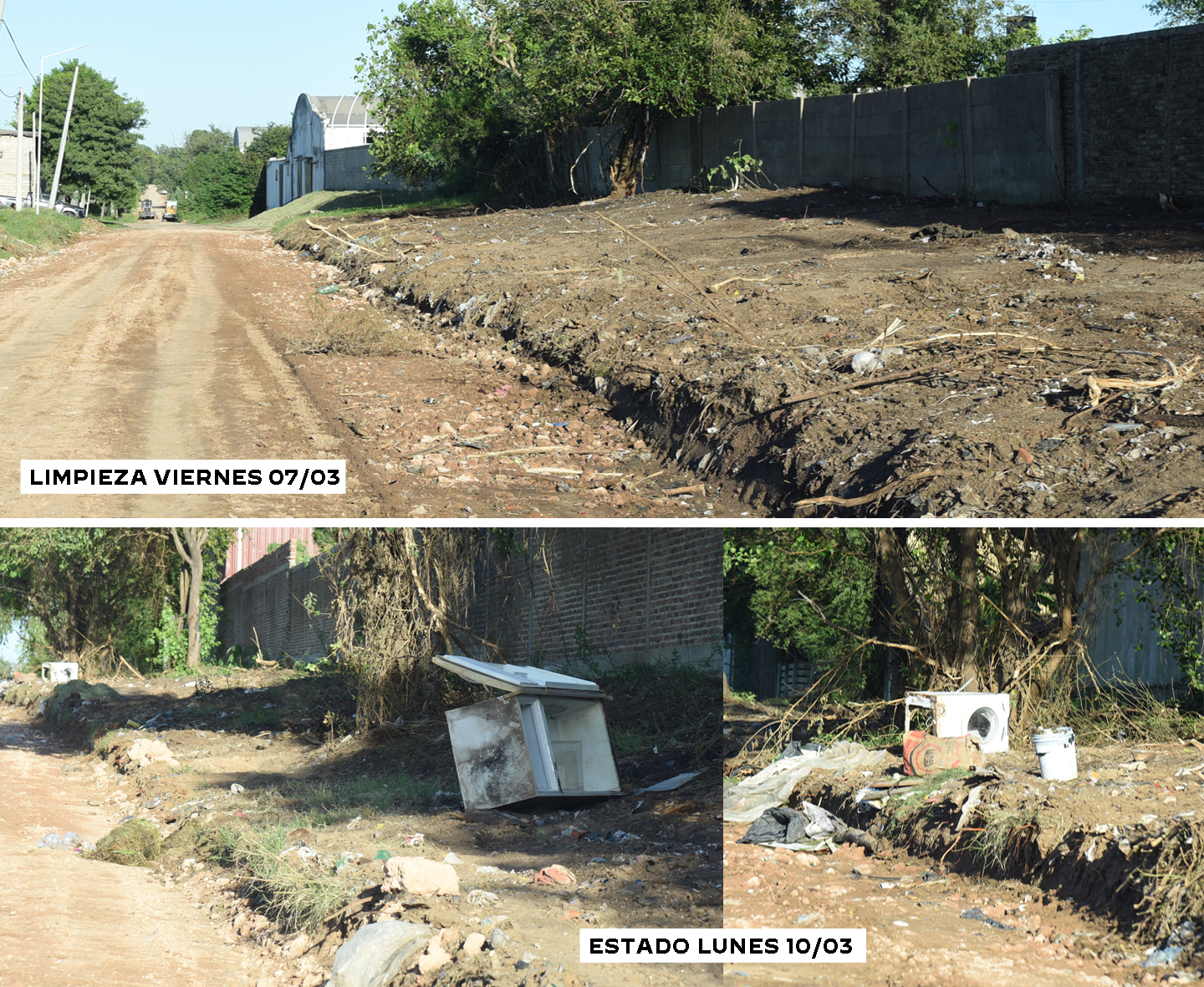 A pesar del esfuerzo realizado la semana anterior por cuadrillas de la Municipalidad, entre los días sábado 8 y domingo 9 se ha vuelto a arrojar residuos en los mismos lugares, los que incluyeron una heladera y un lavarropas.