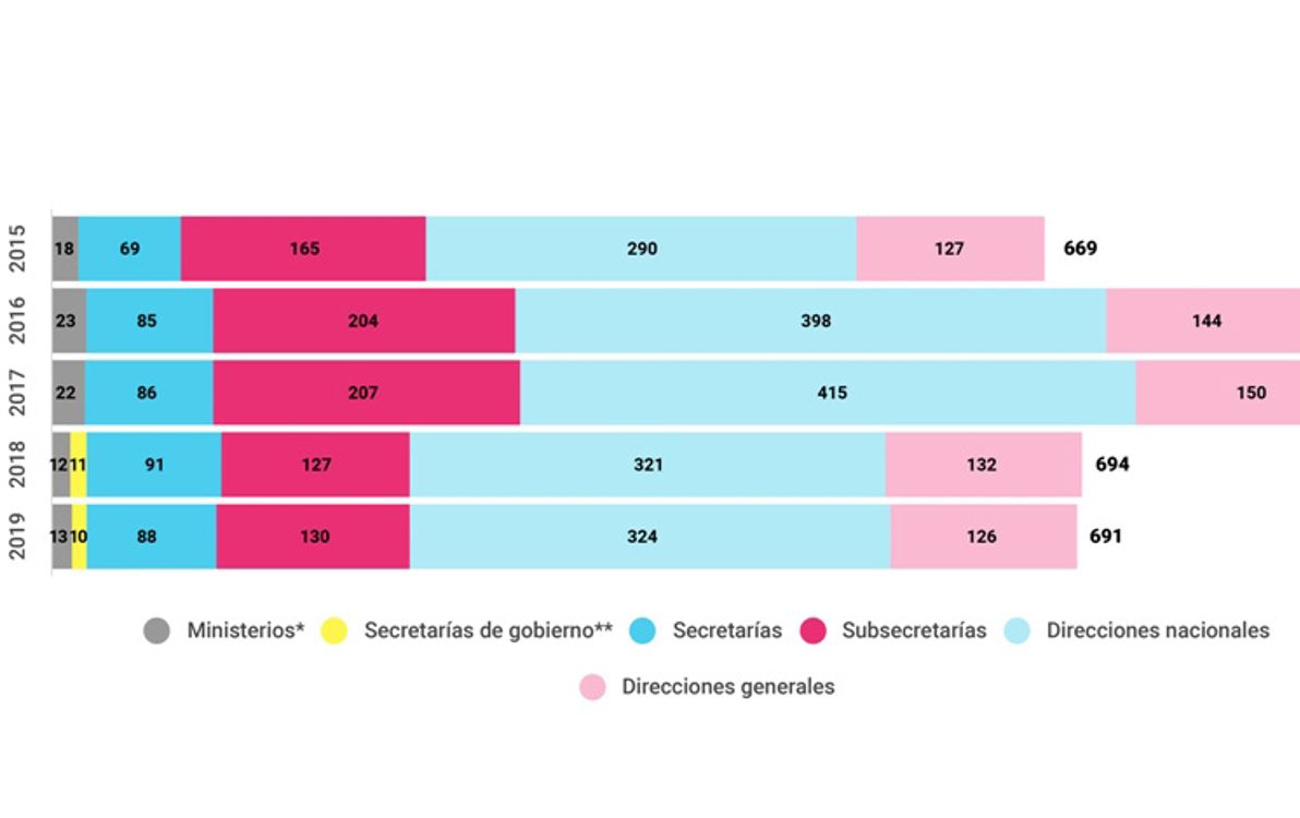Durante el primer año de gestión macrista, la APN creció en todos sus niveles: en cantidad de ministerios (de 18 a 23), de secretarías (de 69 a 85), de subsecretarías (de 165 a 204), de direcciones nacionales (de 290 a 398) y de direcciones generales (de 127 a 144). En los dos primeros años de gestión la estructura pública aumento un 32% para luego reducirse a un 22% en los últimos dos años.