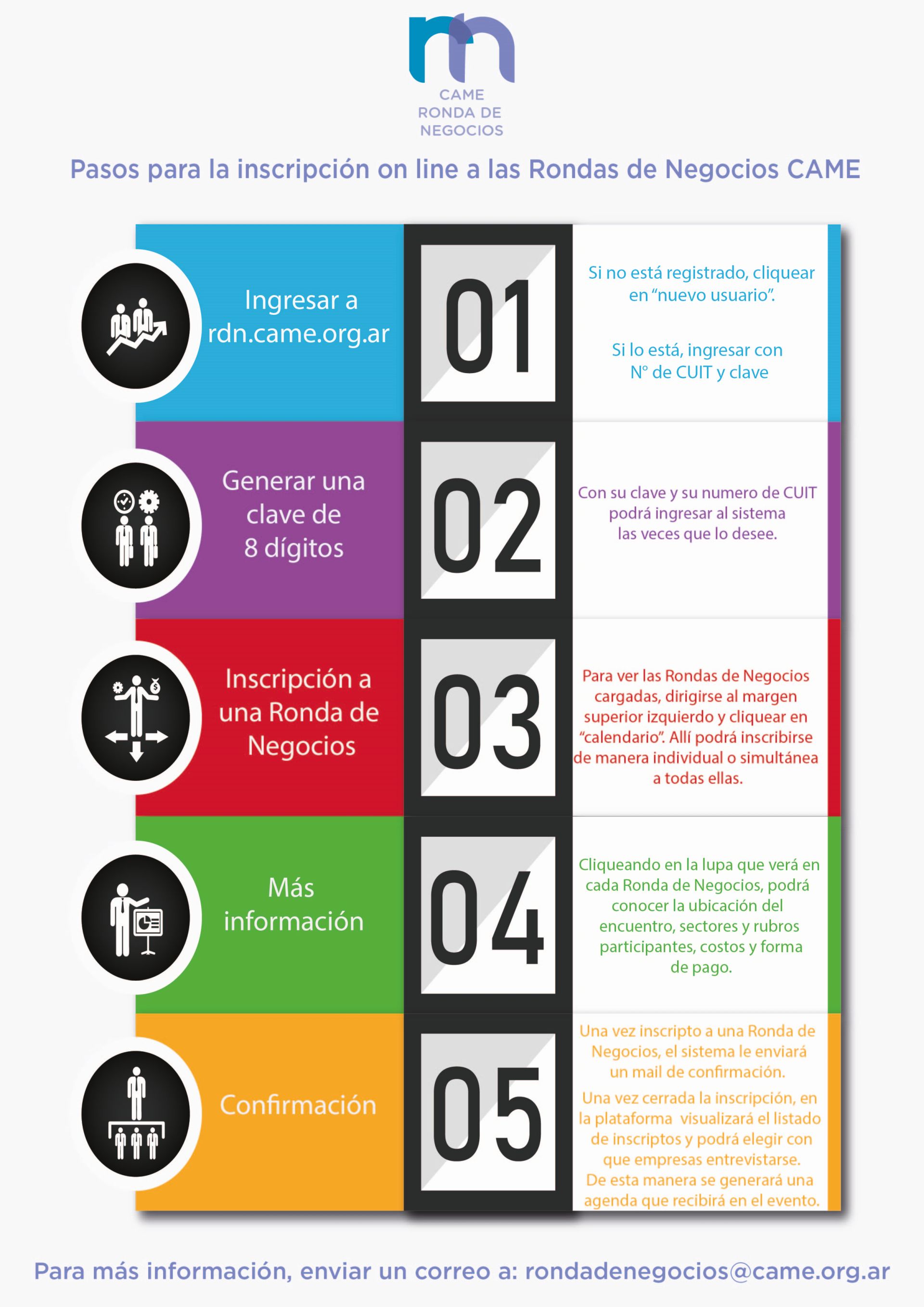INSCRIPCIÓN: Para participar del evento debe inscribirse ingresando a http://rdn.came.org.ar/ Si aún no ha generado su usuario, se envía en adjunto el instructivo para realizarlo. Una vez cerrada la inscripción, ingresando a la plataforma, en la ronda de negocios elegida podrá visualizar el listado de inscriptos y automáticamente elegir con que empresas entrevistarse. Con esa información se generará su agenda de entrevistas, que le será entregada en el momento de acreditarse al evento.