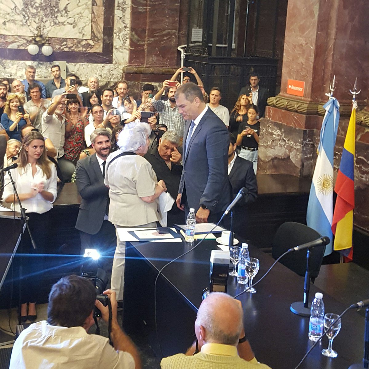 Con motivo de la visita a Rosario por el acto de la UNR, el Concejo municipal declaró “visitante distinguido” de la ciudad al ex presidente ecuatoriano.