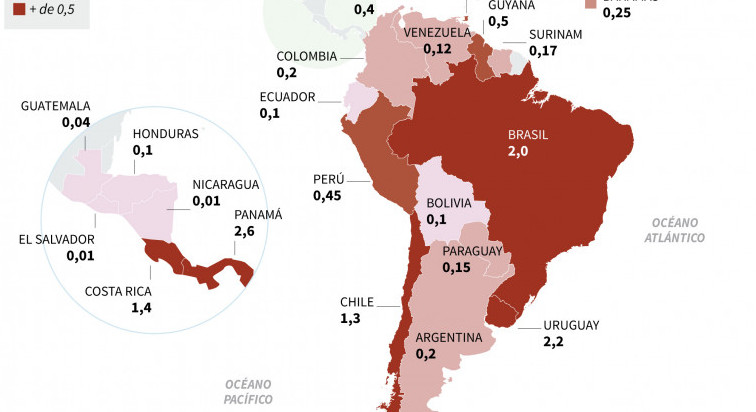 El país que le sigue es Uruguay, con una tasa de 2,2 personas contagiadas cada 100.000 habitantes.