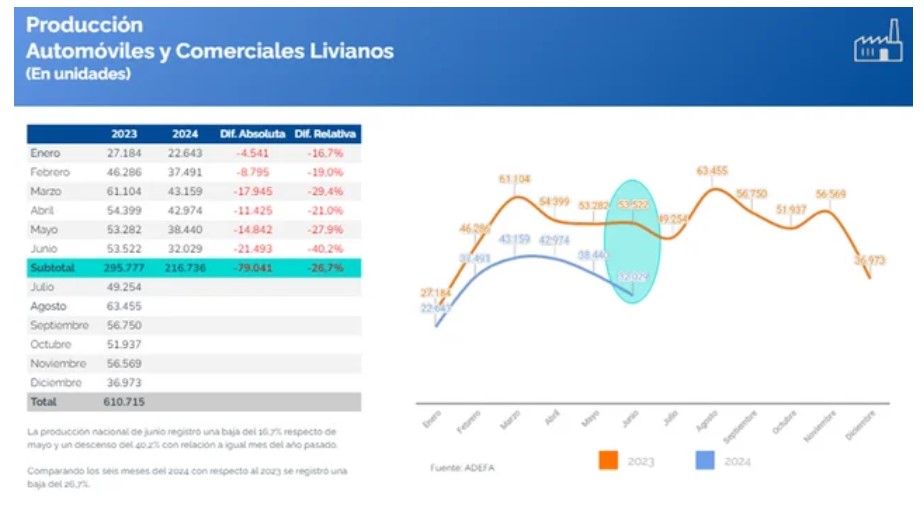 En el acumulado de los primeros seis meses del 2024, las terminales produjeron 216.736 vehículos de pasajeros y utilitarios, 26,7% menos respecto de las 295.777 unidades que se produjeron en el mismo período del 2023.