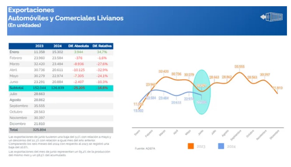 El sector exportó 20.884 unidades, es decir, registró una baja de 9,1% en su comparación con el mes anterior, y 10,3 % menos respecto del volumen que se contabilizó en junio de 2023.
