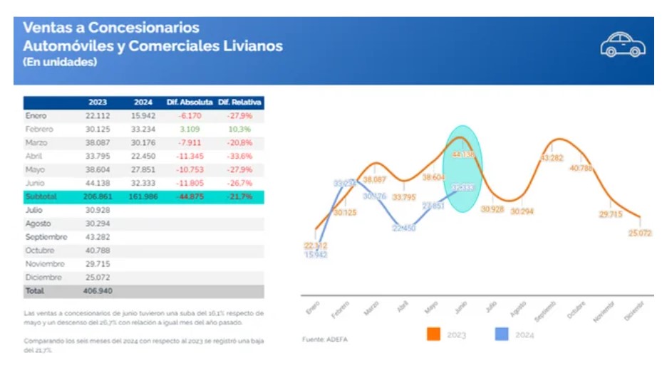 En el acumulado de enero a junio se comercializaron a la red un total de 161.986 vehículos, un 21,7 % menos respecto de las 206.861 unidades que se comercializaron en los primeros seis meses del 2023.
