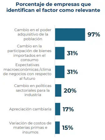 Un factor no menor tiene que ver con que prácticamente la totalidad (97%) de las empresas que redujeron su producción atribuyen tal situación al impacto generado por el menor poder de compra en los ingresos de la población. Le siguen, entre las causas principales mencionadas por los empresarios, las expectativas macroeconómicas y cambio del clima de negocios (31% de las respuestas), y en igual porcentaje el cambio de bienes importados en el consumo interno. Otras causas mencionadas fueron el cambio de políticas sectoriales, la variación de costos de materias primas e insumos y la apreciación cambiaria.