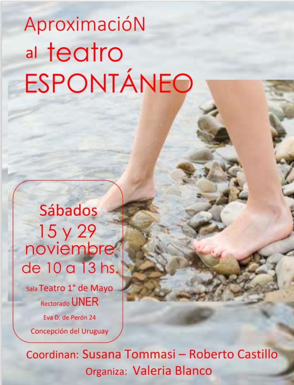 15 de noviembre, 9:30 horas, atravesando la plaza con cajones peruanos, instrumentos, telas y elementos varios rumbo al Rectorado de la UNER de la Ciudad de Concepción del Uruguay, siento todo el entusiasmo de la anticipación por el Taller de “Aproximación al Teatro Espontáneo” que dará inicio en una media hora. Admiro y conozco a los Coordinadores Susana Tommasi y Roberto Castillo, por su múltiple y sólida formación en Psicodrama,Teatro Espontáneo, Teatro del play back, Covisión, etc., y como formadores y directores de diversas Compañías de extensas trayectorias, entre ellas “SAS” y “La Compañía” de Concordia, de las cuales tuve el privilegio de formar parte. Con ellos me he formado y agradezco profundamente la invitación a compartir esta instancia que nos reúne nuevamente aunque la vida nos haya llevado a vivir en puntos diferentes.
