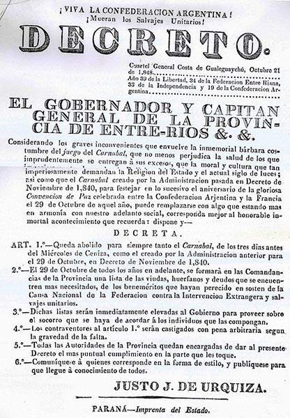 Con fecha 21 de octubre de 1848 el gobernador Urquiza dicta un decreto que deja «abolido para siempre (…) el Carnaval de los tres días antes del Miércoles de Cenizas». También prohibía los festejos celebratorios de la «la gloriosa convención de paz celebrada entre la Confederación Argentina y la Francia» (Arana – Makau de 1840). En substitución de este último carnaval se dispuso ayudar anualmente a los deudos necesitados de las personas que hubieran perecido en el sostén de la Santa Federación. Los infractores a lo ordenado serían castigados con la pena “arbitraria, según la gravedad de la falta.”