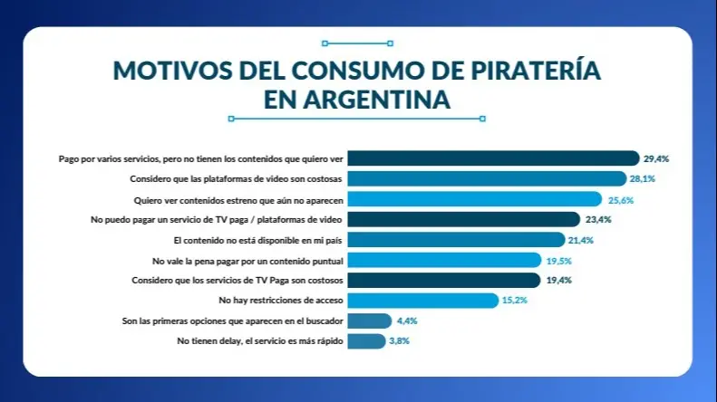 Entre los principales motivos que movilizan el consumo de plataformas ilegales, los encuestados mencionaron: pago por varios servicios, pero no tienen los contenidos que quiero ver (29,4%); considero que las plataformas de video son costosas (28,1%); quiero ver contenidos estreno que aún no aparecen (25,6%); no puedo pagar un servicio de TV paga / plataformas de video (23,4%); el contenido no está disponible en mi país (21,4%); no vale la pena pagar por un contenido puntual (19,5%); considero que los servicios de TV Paga son costosos 19,4%; no hay restricciones de acceso 15,2%; son las primeras opciones que aparecen en el buscador 4,4%; no tienen delay, el servicio es más rápido (3,8%).