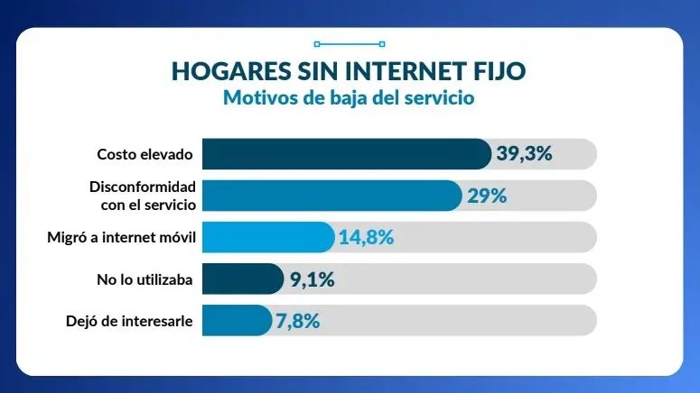Entre los motivos de baja del servicio, el 39,3% lo hizo por el costo elevado y el 29% por disconformidad con el servicio. En los hogares donde se manifestó contar con disponibilidad de fibra óptica para su contratación, el 18% había intentado tramitar la conexión, cuando en agosto 2023 era de 23%. De ese universo, el 41% fundamentó el costo elevado de la contratación.