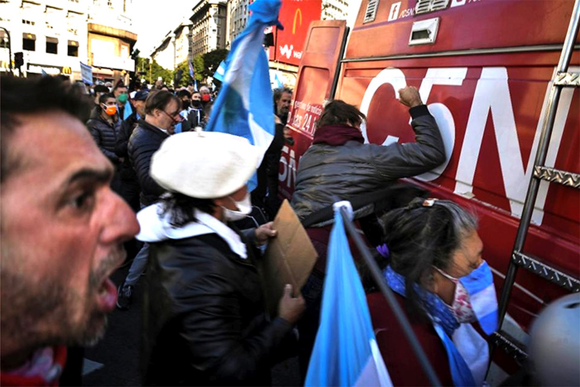 Y lo vivimos en estos días en que una promocionada presentadora de televisión bebe en cámara dióxido de cloro, y Lanata se burla del cuerpo de la vocera del ministerio de Salud, Carla Vizzotti, y Pergolini trata de imbéciles e hijos de puta a quienes votaron la ley de teletrabajo, y Carlos Rodríguez, gurú de los economistas ultraliberales, postea en Twitter “No quiero más empleadas domésticas con gobierno peronista”, y Baby Etchecopar dice que Cristina es un cáncer, y Fernando Iglesias retuitea un mensaje que llama a armarse con ametralladoras, y presuntos intelectuales del macrismo denuncian que el gobierno impone una infectadura, y proliferan en la televisión los mensajes anticuarentena y antivacuna.