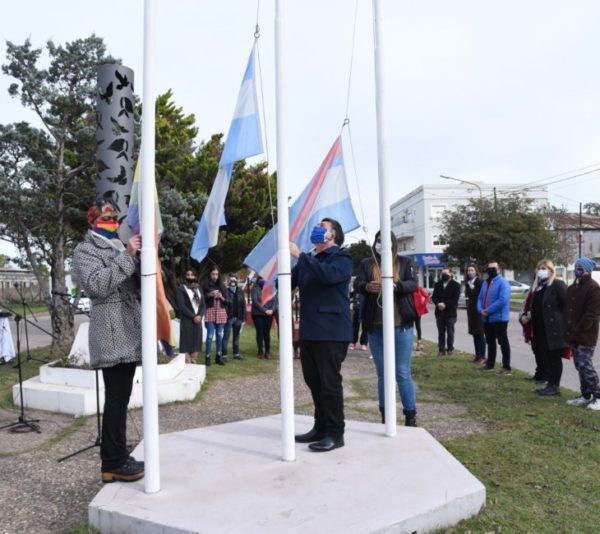 Allí se encontraron miembros representantes de la comunidad LGBTIQ+, funcionarios municipales, concejalas, la Directora Departamental de Educación Ana María Díaz, el Director de Derechos Humanos Darío Barón, la Directora de Mujeres, Géneros y Diversidad Ileana Fernández Escobar y el propio Presidente Municipal Martín Oliva, quien junto a Azul Cañuete y a Fanny Saldivia, procedió al izamiento de los pabellones Nacional, de Entre Ríos y de la Diversidad.