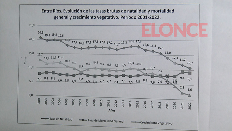 “La provincia está por debajo de lo que se denomina el nivel de reemplazo”, señaló el especialista. Y detalló: “Si se analizan las tasas de crecimiento operadas de 2001 a 2010, hubo una tasa relativamente baja en comparación al promedio nacional. El crecimiento anual en Entre Ríos estaba en un 7.3 por 1.000 habitantes mientras que a nivel nacional era de 11. En cambio, de 2010 a 2022, se emparejan y la tasa de crecimiento anual de la provincia llega a ser un poco más alta, del 12.3 por 1.000 habitantes, mientras que la nacional fue de 11.4 por 1.000 habitantes”.
