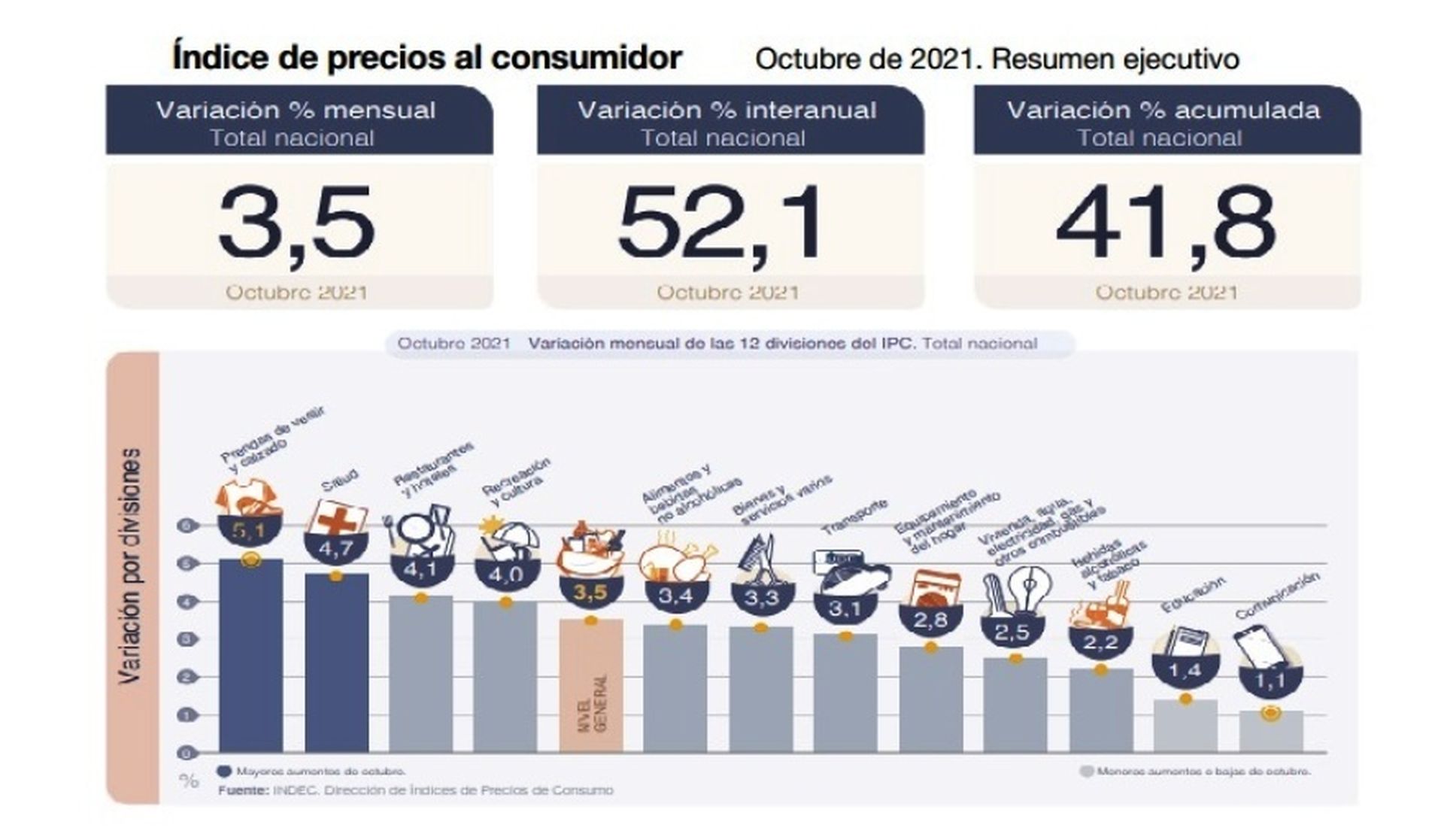 Según dio a conocer el Instituto Nacional de Estadísticas y Censos (INDEC), que conduce el dirigente opositor, Marco Lavagna, el nivel general del Índice de precios al consumidor (IPC) representativo del total de hogares del país registró en octubre una variación de 3,5% con relación al mes anterior. Una síntesis de las variaciones de precios correspondientes a cada división de la canasta del IPC se puede observar en el cuadro.