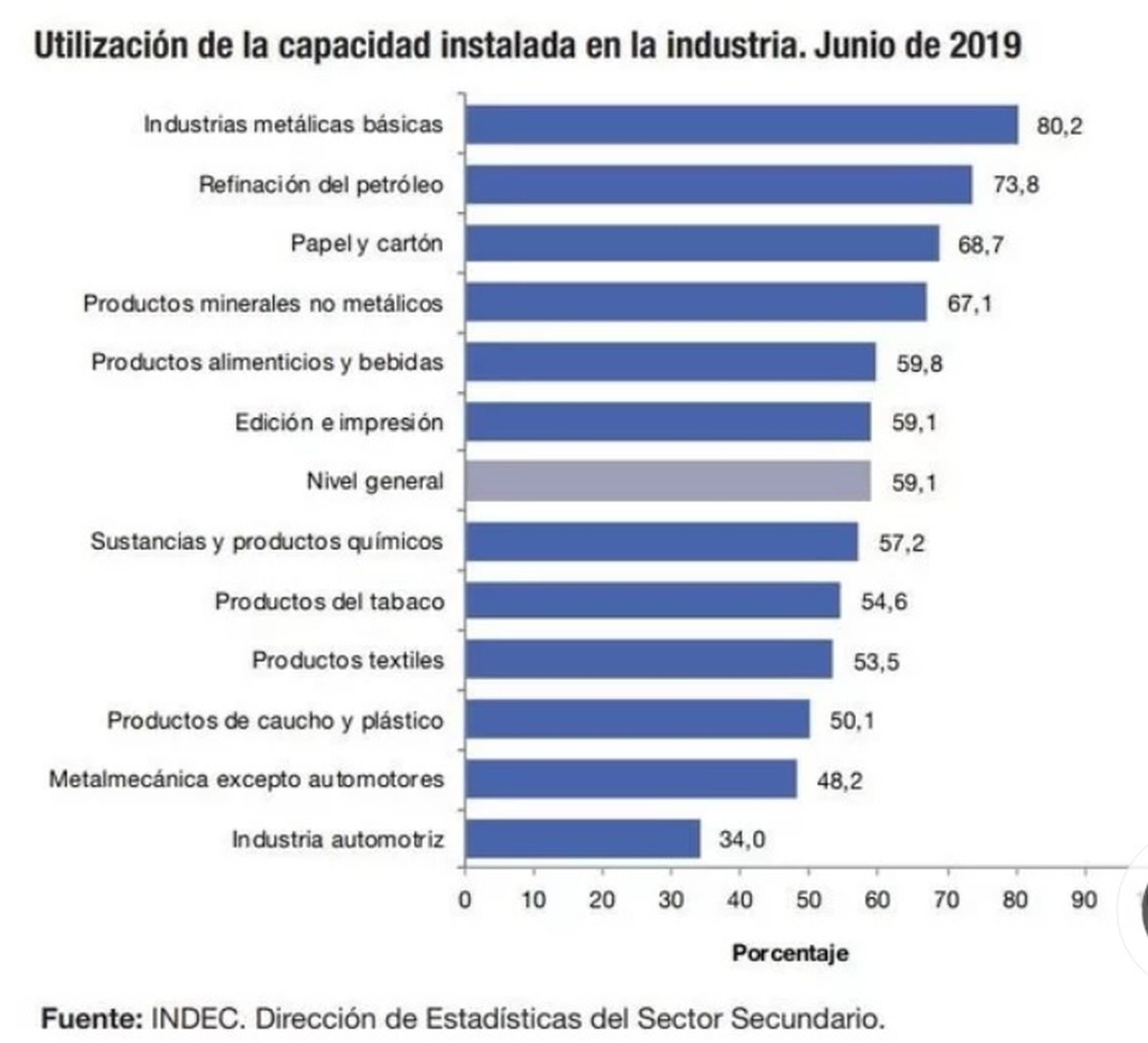 Por su parte, los sectores que se ubican por debajo del nivel general de la industria son: sustancias y productos químicos 57,2%, productos del tabaco 54,6%, productos textiles 53,5%, productos de caucho y plástico 50,1%, la industria metalmecánica excepto automotores 48,2% y la industria automotriz 34,0%.