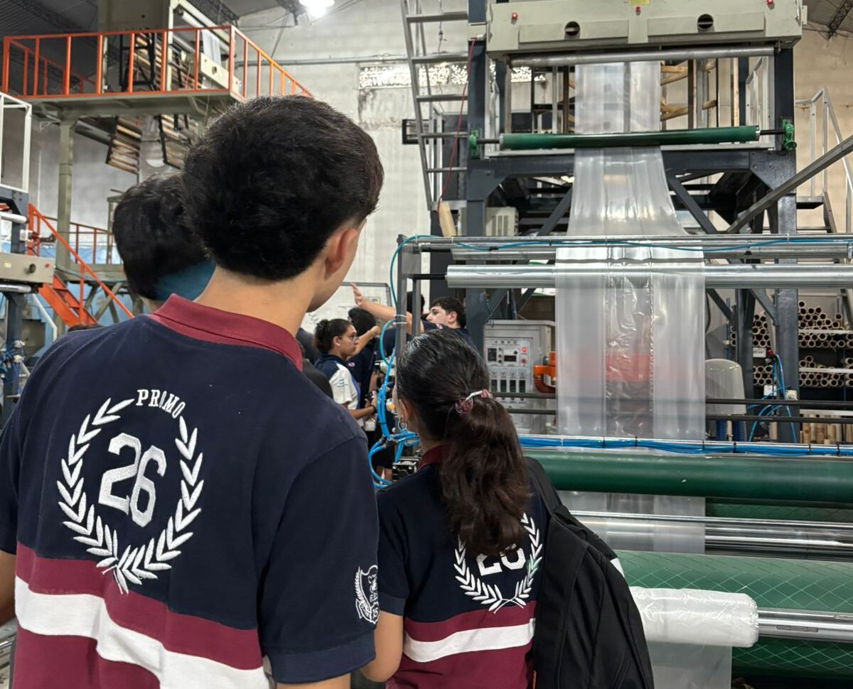 Luego de la charla inicial, los estudiantes recorrieron la empresa Embolsar, donde fueron recibidos por los hermanos Villamea, quienes compartieron el proceso productivo, el funcionamiento diario de la empresa y la experiencia de emprender y crecer dentro del sector industrial.