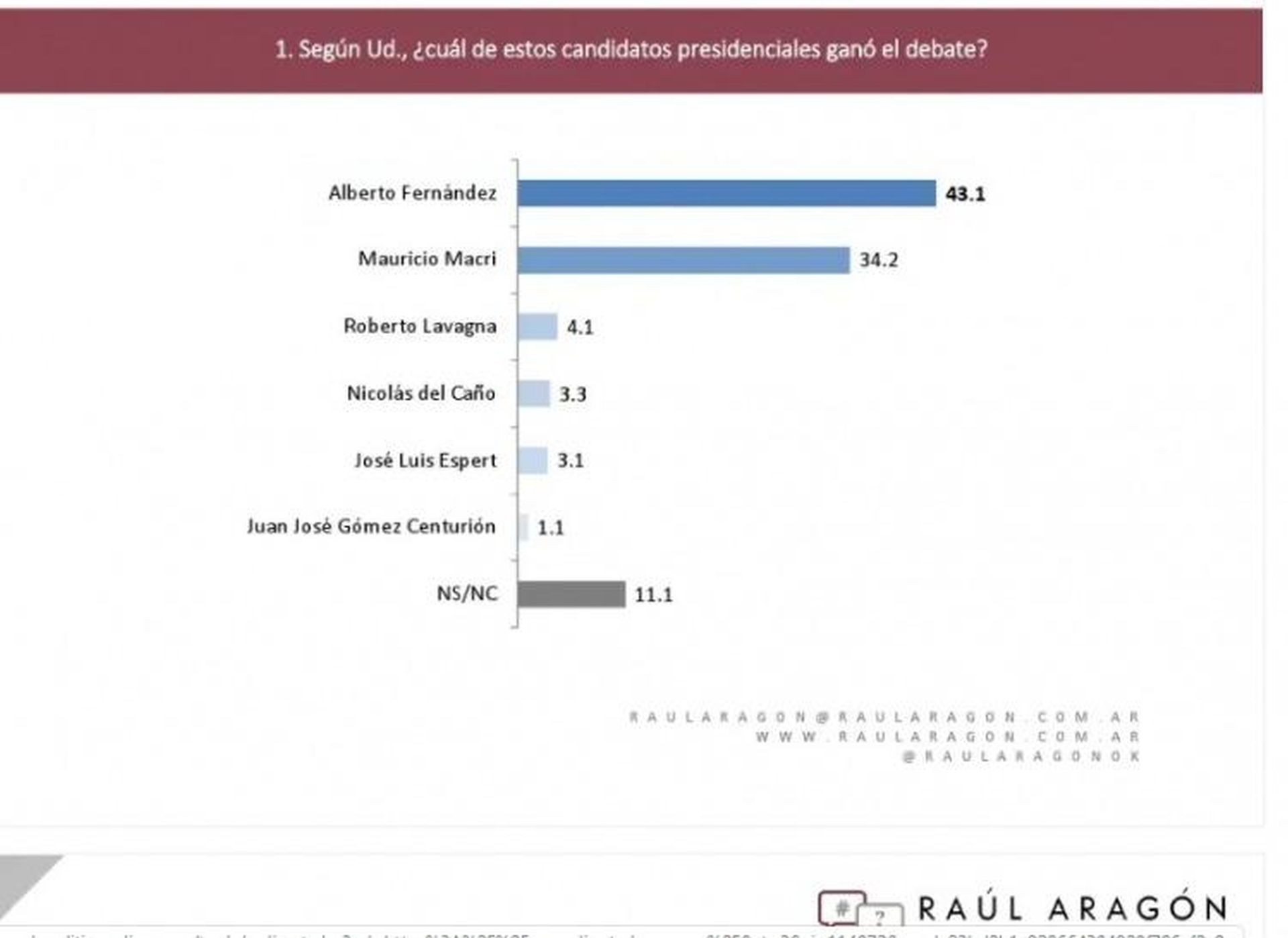 El 43,1 por ciento de los 1500 consultados por Aragón dijo que vio ganador a Fernández, mientras que un 34,2 por ciento se inclinó por Macri. Un 11 por ciento respondió que no sabe quien se impuso.