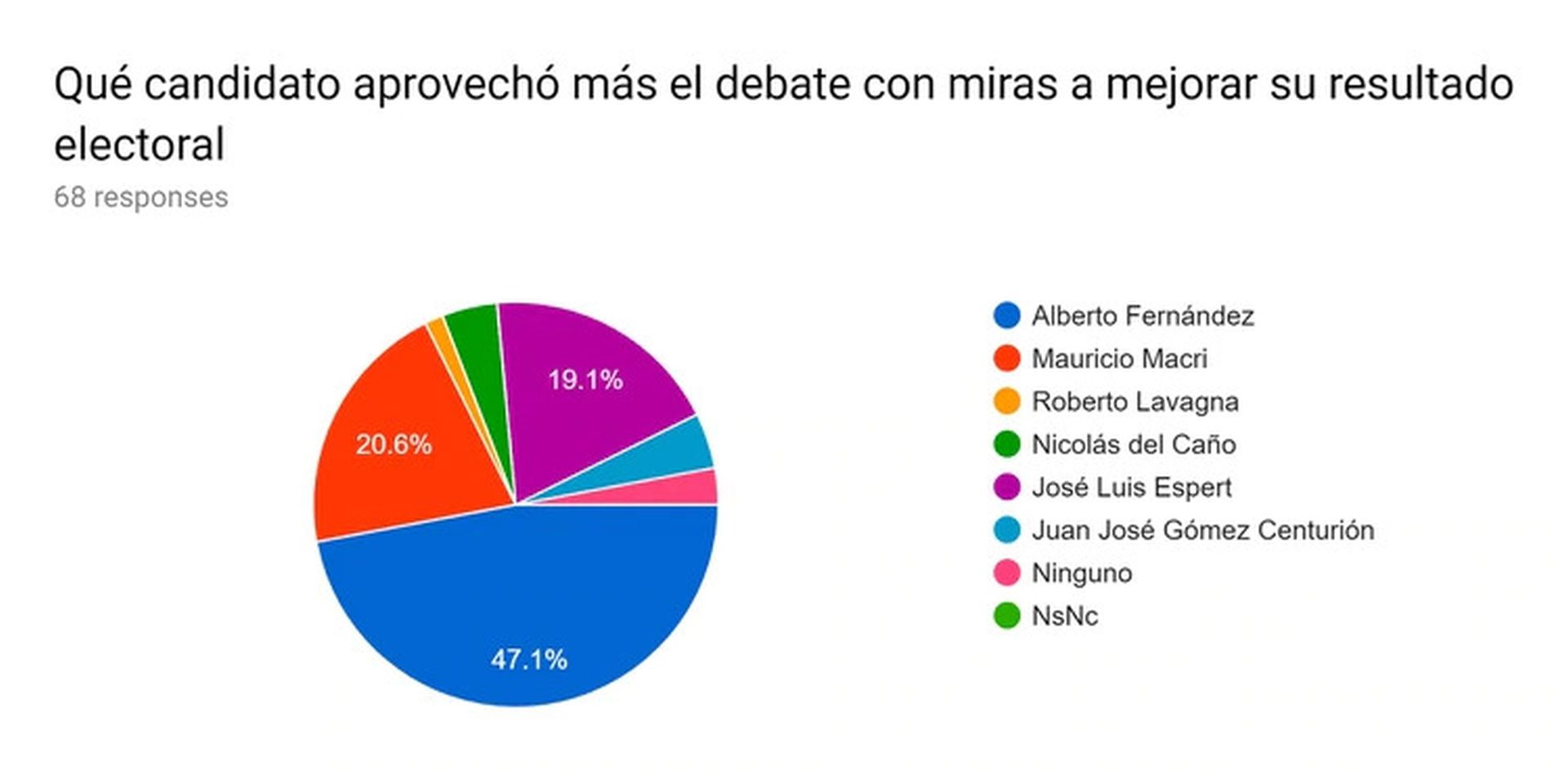Un panel de profesionales de comunicación empresaria y política determinó que el candidato Alberto Fernández ganó el debate: el 48 por ciento sostiene que lo aprovechó mejor con miras a mejorar su resultado en las elecciones presidenciales del 27 de octubre. También fue el que obtuvo el mejor puntaje del 1 al 10 en cuanto a su performance: 6,91, y el que, según creen los expertos en comunicación, ganará la elección (87%).