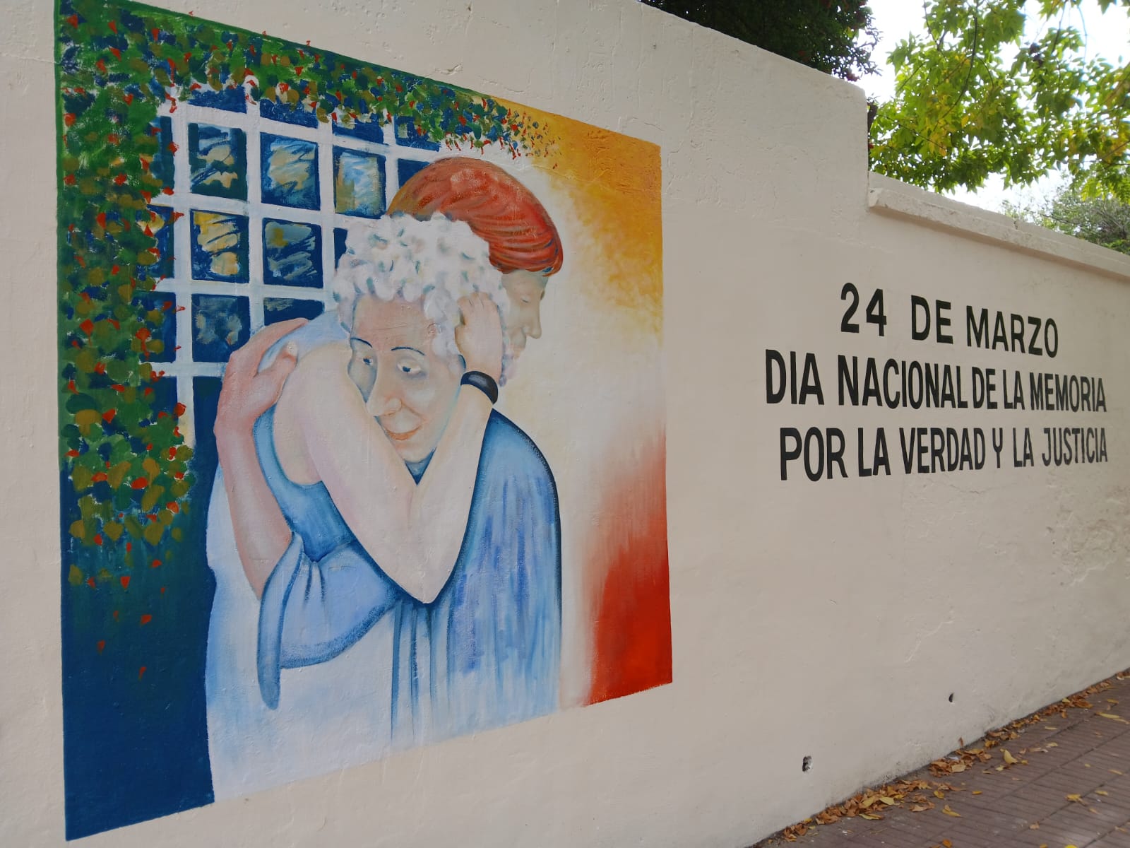 En el marco de la Semana “El Arte en la Memoria”, organizada por la Dirección de Derechos Humanos de la Municipalidad, en el paredón lateral de la Dirección Departamental de Escuelas fue reinaugurado el mural “El Abrazo”, que recuperó el brillo de la mano del artista plástico Eduardo Lorusso, su autor, junto a Silvia Garnier, recordando que el arte es guardián de nuestra identidad y que hay abrazos que el tiempo no puede borrar.