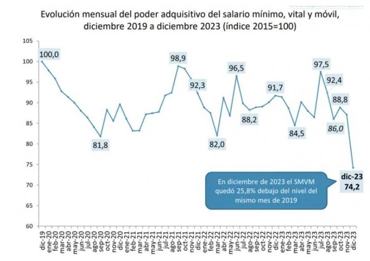 En el mes de diciembre pasado, tras el fuerte aumento en los precios, el salario mínimo se redujo en términos reales en 14,8% en un solo mes. Quedó así en un valor que resulta 25,9% más bajo que el de diciembre de 2019 y 42,9% más bajo que el del mismo mes de 2015.