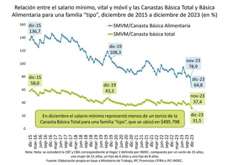 «Los bajos valores del salario mínimo implican que no alcance siquiera para la adquisición de la canasta básica alimentaria correspondiente a una ´familia tipo`. El costo de esa canasta, que define el límite de la indigencia, fue $ 240.679 en diciembre; es decir que los $156.000 del salario mínimo sólo cubrieron el 64,8% de la misma», alerta el reporte de CTA, poniendo énfasis en que el sueldo mínimo, que por ahora Milei pretende dejar así, no sirve ni siquiera para que una familia se alimente con la más baja de las calidades y cantidades posibles.